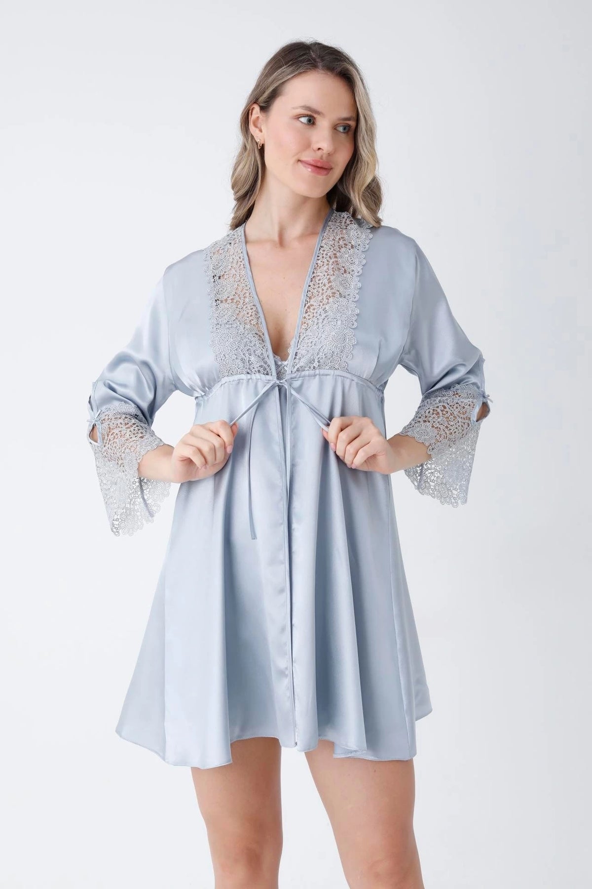 The matching robe is equally stunning, with lace panels on the sleeve and back that complement the lace detailing on the nightdress. The robe comes with a satin ribbon belt, which can be tied to cinch the waist and create a flattering silhouette.