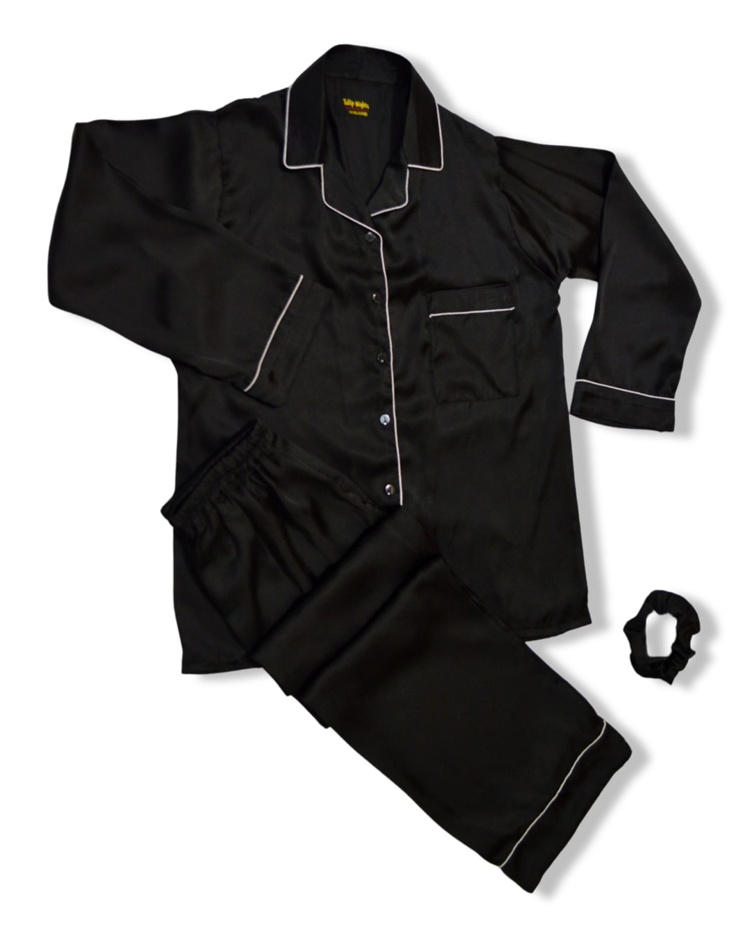 Indulge in the sumptuous comfort of our classic Black Satin PJ Set. Crafted from smooth, silk-like fabric